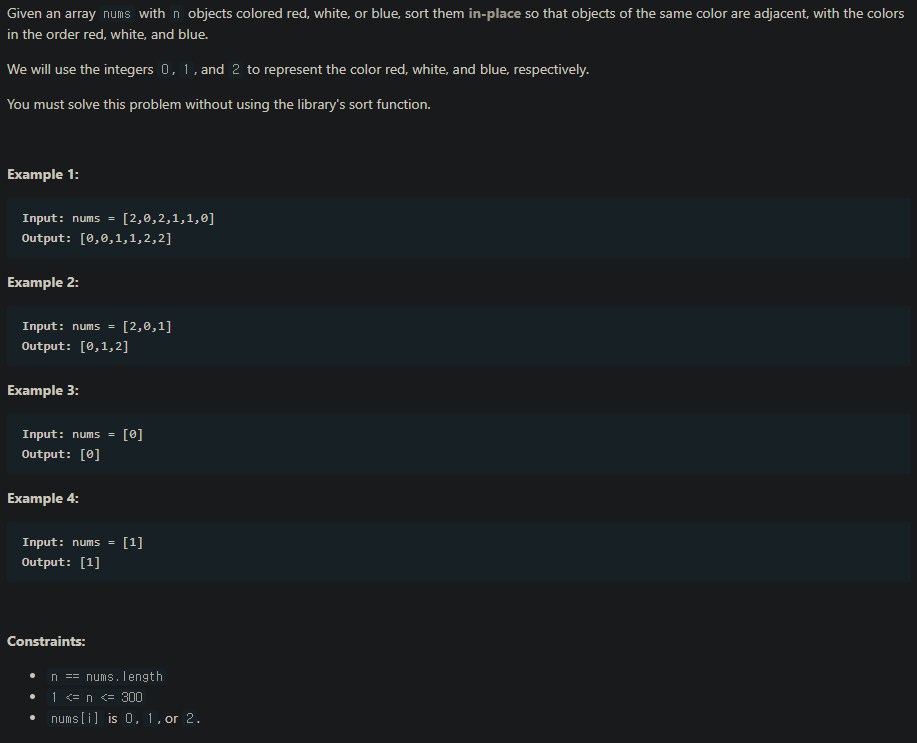 0과 1과 2만 있는 배열 nums를 sort 라이브러리를 사용하지 않고 in-place로 정렬하는 문제다.