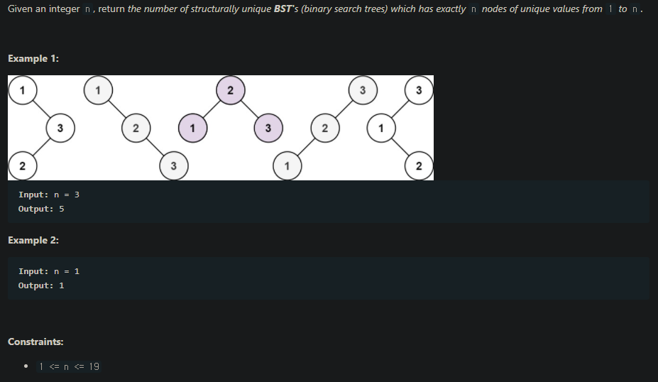 n이 주어졌을때, 1~n이 val로 들어가있는 n개의 노드를 BST로 배열하는 경우의 수를 구하는 문제다.