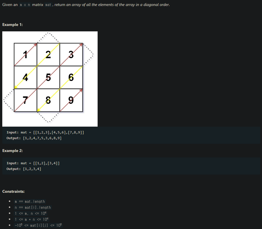 m x n 행렬에 수가 적혀있을때, 이 행렬을 위 그림과 같이 대각선방향 지그재그로 방문해 방문 순서대로 수를 출력하는 문제다.
