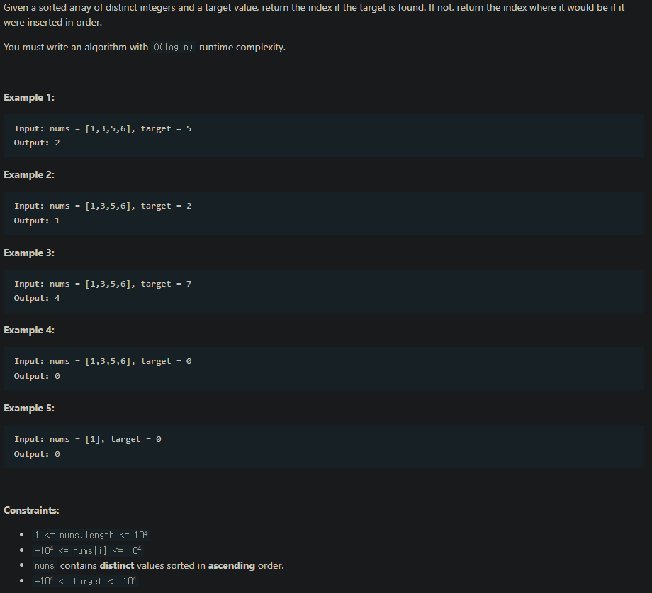 이 때, nums[m]==target 이라면 m을, nums[m] < target 이라면 nums[m] 뒤에 target이 들어가야 하므로 m+1을,