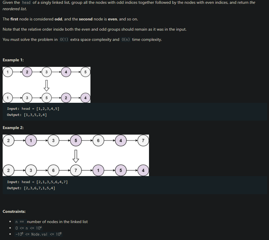 연결리스트가 주어졌을때, 주어진 연결리스트의 짝수 index에 해당하는 노드는 그 노드들끼리, 홀수 index에 해당하는 노드들은 그 노드들끼리 재정렬하는 문제다. head가 짝수 index이므로 짝수 노드들이 먼저 나와야하며 그 외 순서는 본래 연결리스트와 같아야 한다.