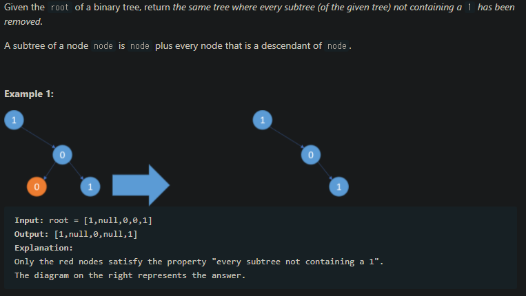 class Solution { public: int sum(TreeNode** node) { if (*node!=NULL) { (*node)->val += sum(&((*node)->left)) + sum(&((*node)->right)); return (*node)->val; } return 0; } void chk(TreeNode** node) { if (*node==NULL) return; if ((*node)->val==0) {*node = NULL; return;} chk(&((*node)->left)); chk(&((*node)->right)); } void reset(TreeNode** node) { int s = 0; if (*node==NULL) return; if ((*node)->left!=NULL) s+=(*node)->left->val; if ((*node)->right!=NULL) s+=(*node)->right->val; (*node)->val = s==(*node)->val? 0:1; reset(&((*node)->left)); reset(&((*node)->right)); } TreeNode* pruneTree(TreeNode* root) { TreeNode** node = &root; sum(node); chk(node); reset(node); return *node; } };'LeetCode' 카테고리의 다른 글