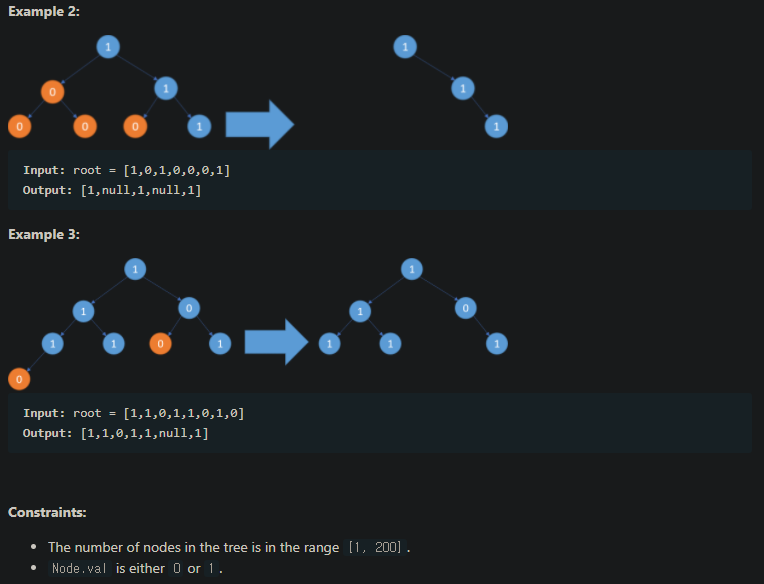 5 3 1 1 1 0 1 0 int sum(TreeNode** node) { if (*node!=NULL) { (*node)->val += sum(&((*node)->left)) + sum(&((*node)->right)); return (*node)->val; } return 0; }2. 간단하다. 바꾼 트리가 나타낸 것이 해당 노드부터 모든 자식노드들까지 1의 개수이므로 해당 노드의 값이 0이면 제거해주면 된다.