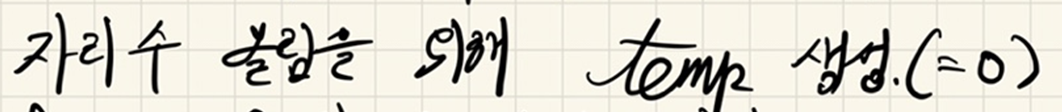 뒤에서 부터 덧셈할때, 10이 넘어가면 앞자리수를 올려줘야하므로, 이를 저장할 temp 변수를 생성해준다.