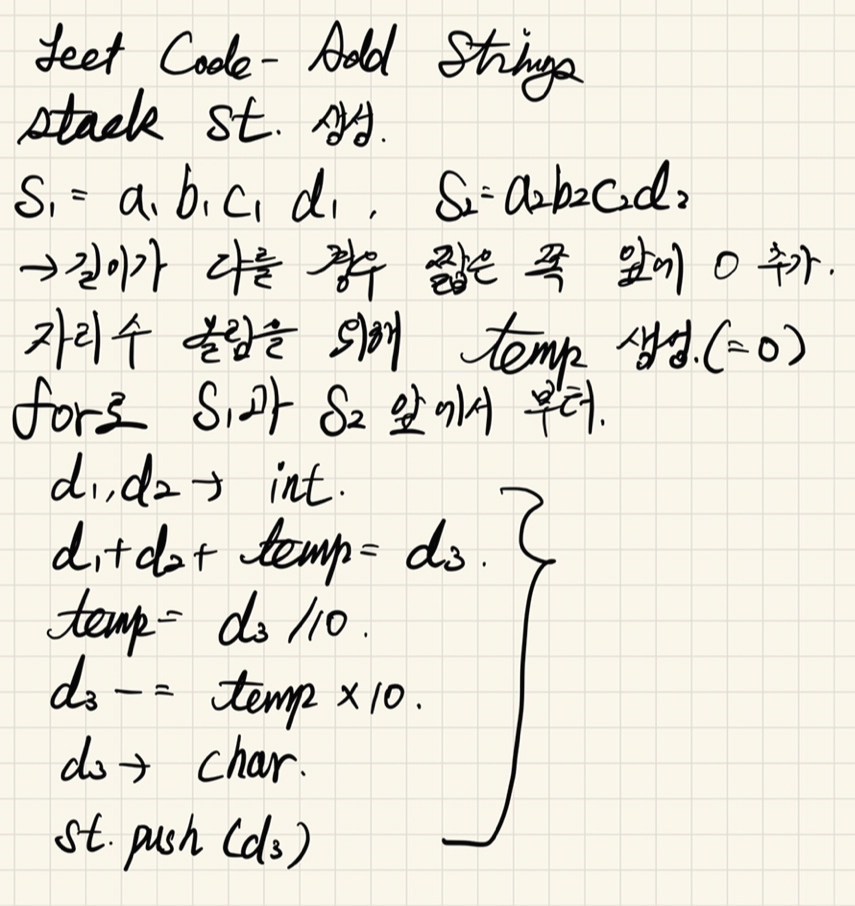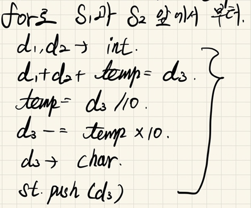 for (int i=num1.size()-1; i>-1; i--) { int a = int(num1[i]) - '0'; int b = int(num2[i]) - '0'; int c = a+b+temp; temp = c/10; c -=temp*10; st.push(char(c+'0')); }마지막으로 제일 앞자리수를 더했을때 temp가 1이라면 temp도 넣어준다.