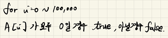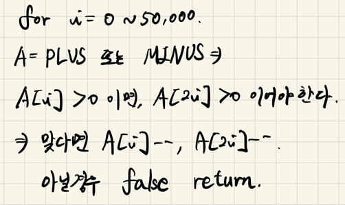 마지막으로 0부터 100000까지 훑어주며 남아있는 수가 있다면 이는 쌍이 없는 경우이므로 false를 던지고,