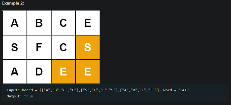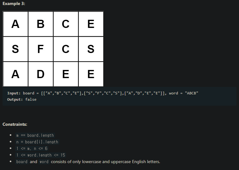 그리고 또 다른 알파벳문자열이 주어졌을때, 그리드 안에서 인접한 알파벳들을 연결해 해당 문자열을 만들 수 있는지 묻는 문제다.