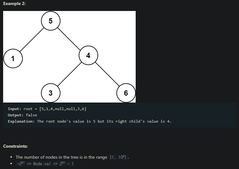 이진 트리가 주어졌을때, 이 이진트리가 이진탐색트리인지 (왼쪽 자식노드들이 모두 부모노드보다 작고, 오른쪽 자식노드들은 모두 부모노드보다 큰지) 확인하는 문제다.