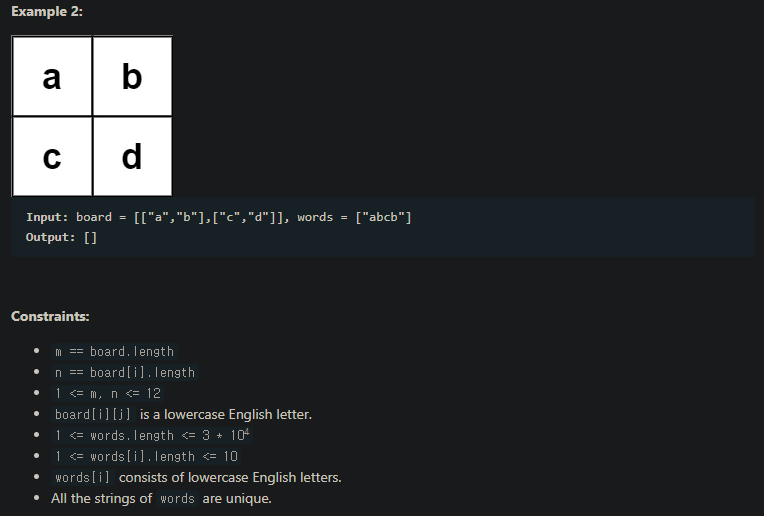 class Solution { public: struct Trie{ int val; Trie* next[26]; Trie() { this->val = 0; for (int i=0; i<26; i++) this->next[i] = NULL; } }; vector<string> ret; vector<vector<char>> board; vector<string> findWords(vector<vector<char>>& board, vector<string>& words) { Trie* root = new Trie(); Trie* cur; for (auto word:words) { cur = root; for (int i=0; i<word.size(); i++) { if (cur->next[word[i]-'a']==NULL) cur->next[word[i]-'a'] = new Trie(); cur = cur->next[word[i]-'a']; } cur->val = 1; } cur = root; int chk[12][12]; this->board = board; for (int i=0; i<12; i++) for (int j=0; j<12; j++) chk[i][j] = 0; for (int i=0; i<26; i++) { if (cur->next[i]==NULL) continue; string temp = ""; temp += (char)i + 'a'; for (int j=0; j<this->board.size(); j++) { for (int k=0; k<this->board[j].size(); k++) { if (board[j][k]==i+'a') { search(cur->next[i], make_pair(j,k), chk, temp); } } } } return this->ret; } void search(Trie* cur, pair<int,int> pos, int chk[12][12], string word) { int y = pos.first, x = pos.second; if (x<0 || y<0 || x==this->board[0].size() || y==this->board.size() || chk[y][x]==1 || word[word.size()-1] != this->board[y][x]) return; chk[y][x] = 1; if (cur->val) { this->ret.push_back(word); cur->val = 0; } for (int i=0; i<26; i++) { if (cur->next[i]==NULL) continue; string temp = word+(char)(i+'a'); search(cur->next[i],make_pair(y-1,x),chk, temp); search(cur->next[i],make_pair(y,x-1),chk, temp); search(cur->next[i],make_pair(y+1,x),chk, temp); search(cur->next[i],make_pair(y,x+1),chk, temp); } chk[y][x] = 0; } };'LeetCode' 카테고리의 다른 글