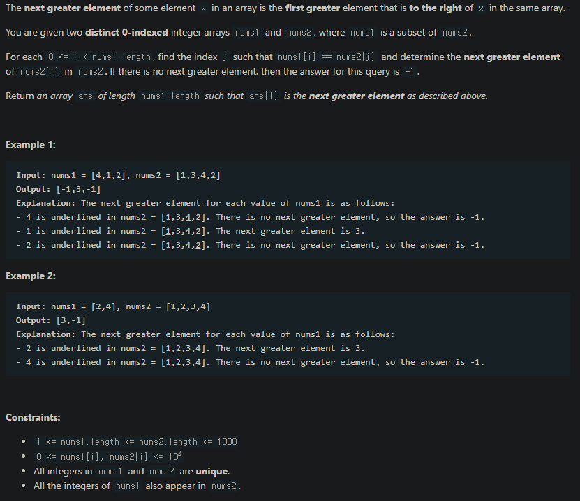 nums1 배열은 nums2의 부분집합인데, 배열의 순서가 조금 다르다.