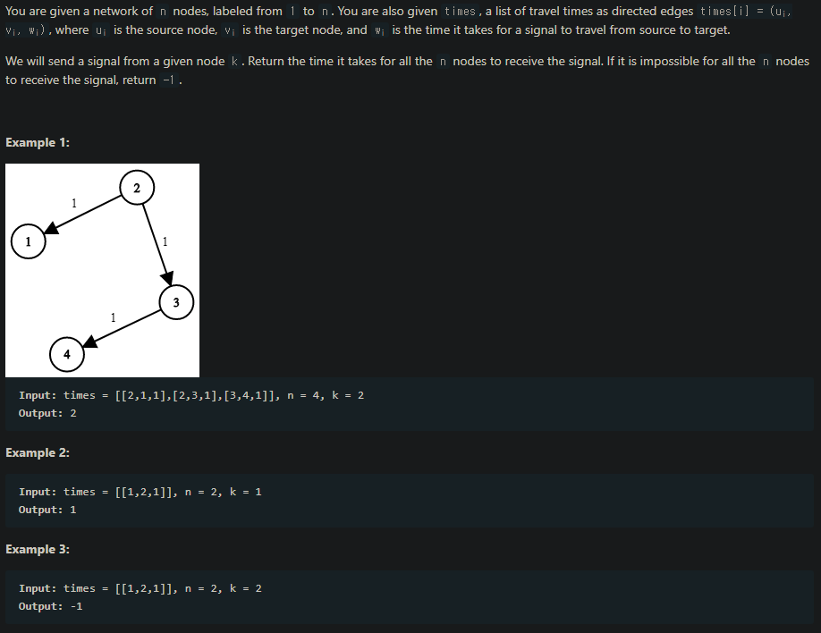 class Solution { public: struct compare {bool operator()(pair<int, int> a, pair<int, int> b) {return a.second>b.second;}}; int networkDelayTime(vector<vector<int>>& times, int n, int k) { long G[105][105]; for (int i=1; i<=n; i++) for (int j=1; j<=n; j++) G[i][j] = i==j?0:INT_MAX; for (vector<int> time:times) G[time[0]][time[1]] = time[2]; priority_queue<pair<int,int>, vector<pair<int,int>>, compare> pq; for (int i=1; i<=n; i++) pq.push(make_pair(i,G[k][i])); while (!pq.empty()) { pair<int, int> p = pq.top(); pq.pop(); G[k][p.first] = G[k][p.first]<p.second?G[k][p.first]:p.second; for (int i=1; i<=n; i++) if (G[k][i] > G[k][p.first] + G[p.first][i]) { G[k][i] = G[k][p.first] + G[p.first][i]; pq.push(make_pair(i,G[k][i])); } } int ret = 0; for (int i=1; i<=n; i++) { if(G[k][i]==INT_MAX) return -1; else ret = ret>G[k][i]? ret:G[k][i]; } return ret; } };'LeetCode' 카테고리의 다른 글